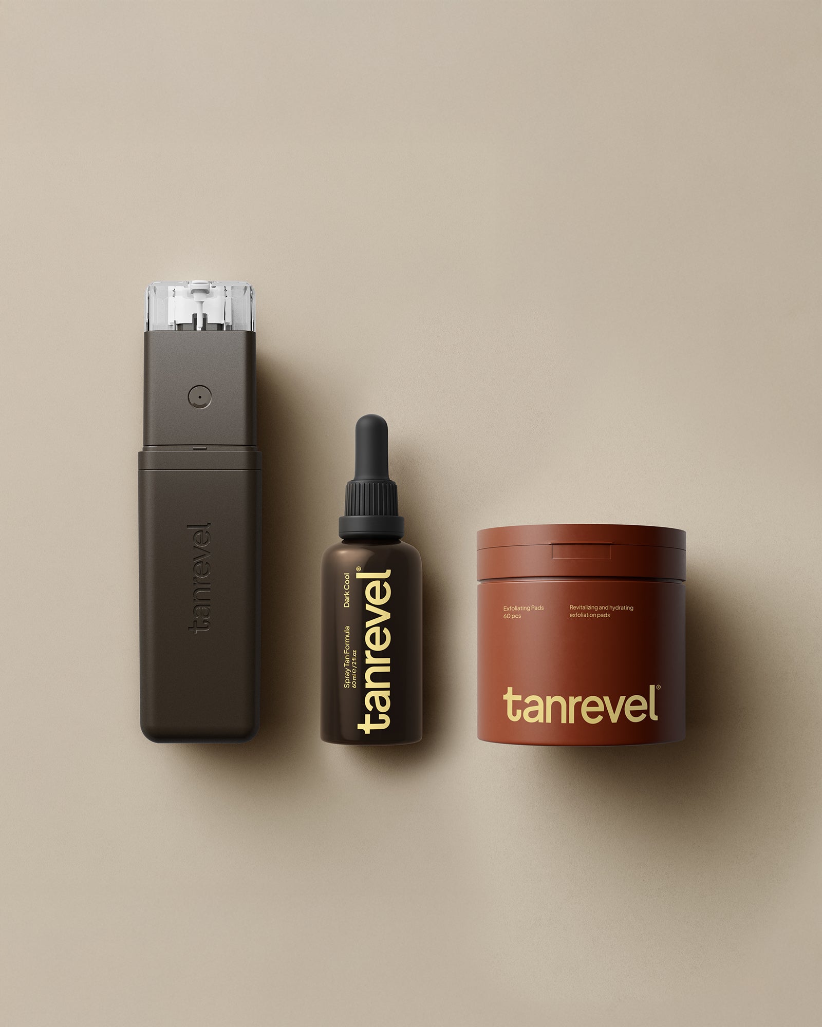 Skapa en professionell look hemma med Tanrevel® Prime & Tan Trio, ditt perfekta kit för mjuk, återfuktad och jämnt solkysst hud. Börja din rutin med Exfoliating Pads, framtagna för att varsamt exfoliera och vårda din hud. Med en kraftfull kombination av AHA, PHA och LHA stimulerar dessa pads cellförnyelse, rengör porer och förbättrar hudstrukturen, vilket skapar den perfekta basen för en jämn och hållbar brun utan sol. Berikade med niacinamid, kamomill, centella asiatica, hyaluronsyra och aloe vera, lugnar, återfuktar och mjukgör de huden samtidigt som de stärker hudens naturliga barriär. Fortsätt med Spray Tan Device Pro och Spray Tan Formula Dark Cool, Skandinaviens mest sålda brun utan sol-enhet, för att uppnå en naturlig, gyllene ton på bara 60 sekunder.